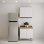 Produzido com materiais de alta qualidade, o conjunto conta com amplo espaço interno, prateleiras bem distribuídas e portas com puxadores ergonômicos, facilitando o dia a dia. O acabamento resistente garante durabilidade e fácil limpeza, enquanto o visual amadeirado adiciona um toque acolhedor ao ambiente.