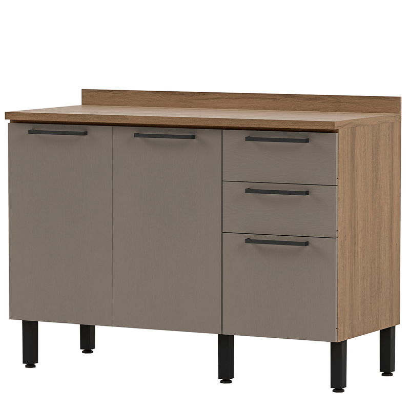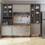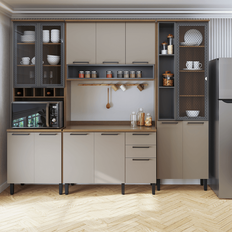 Seu design moderno combina os tons Mel e Fumê, criando um contraste sofisticado que valoriza o ambiente. As portas com puxadores metálicos e o acabamento de alta qualidade garantem durabilidade e um visual contemporâneo. Além disso, os módulos amplos e bem divididos permitem armazenar utensílios, mantimentos e eletrodomésticos de forma prática e acessível.