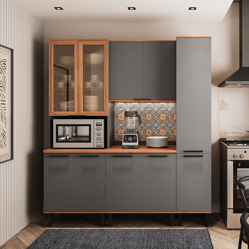 Seu design moderno combina o tom elegante de Cinza com o aconchego da madeira Freijó, criando um ambiente sofisticado e acolhedor. Produzido em MDP de alta resistência, o conjunto garante durabilidade e praticidade no dia a dia, além de contar com puxadores metálicos e bom aproveitamento vertical, ideal para cozinhas de diversos tamanhos.