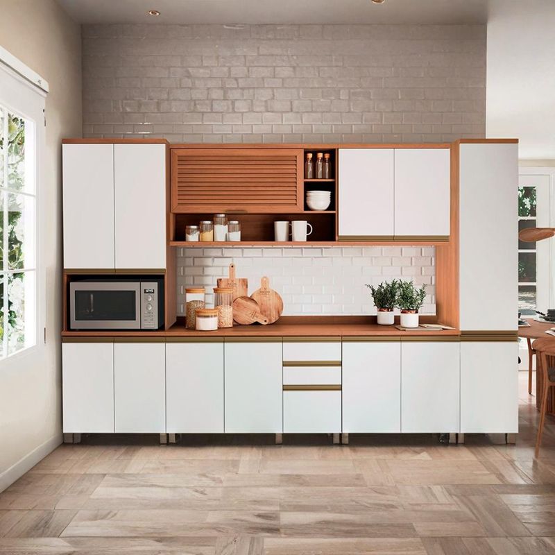 Composto por 6 peças versáteis, o conjunto proporciona excelente aproveitamento de espaço e uma distribuição inteligente, tornando sua cozinha completa, organizada e acolhedora.