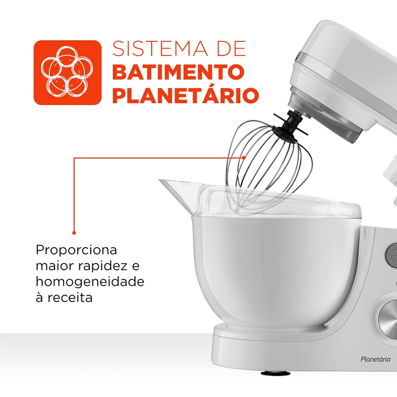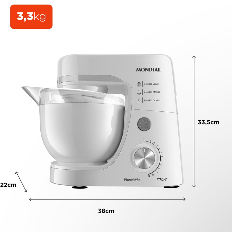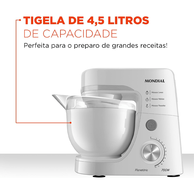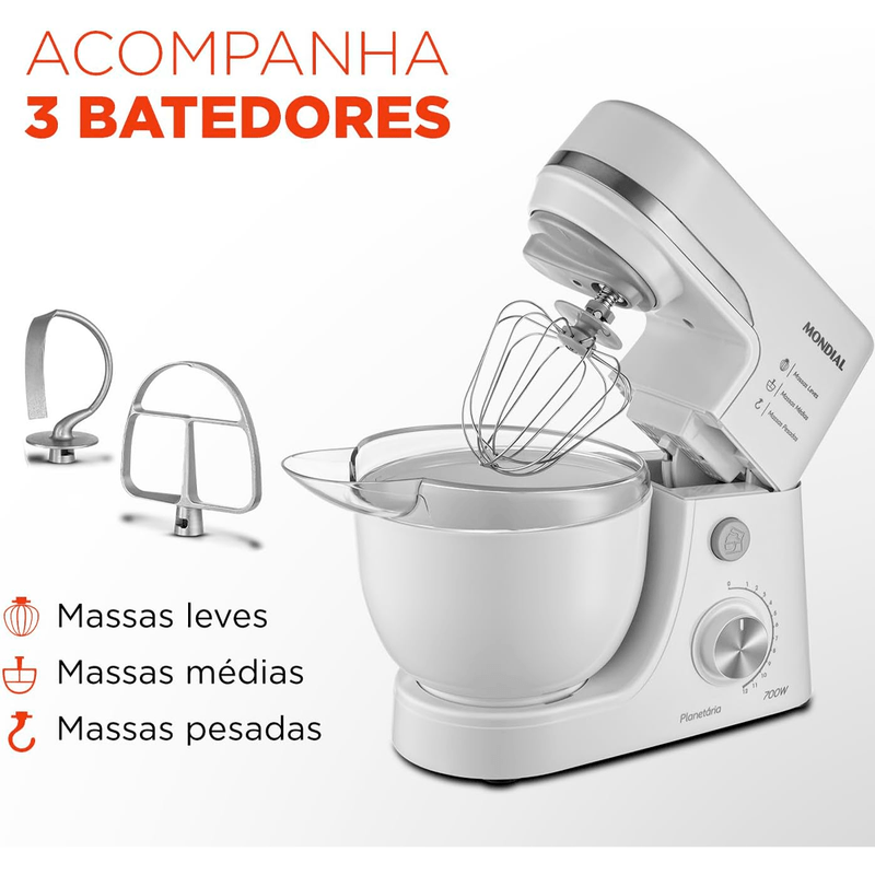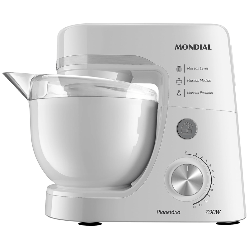 A Batedeira Planetária Mondial BP-03-W vai ser sua principal aliada na cozinha! Ela conta com 700W de potência e 12 velocidades que garantem mais força para bater e misturar os seus ingredientes. Vem com 3 tipos de batedores, para você preparar massas leves, médias e pesadas. Possui tigela com capacidade de 4,5 litros, sistema de abertura automática e tampa antirrespingos. Saiba mais sobre a BP-03-W da Mondial:POTÊNCIA DE 700WMais potência para preparar vários tipos de massas, pães, cremes, chantilly e claras em neve.