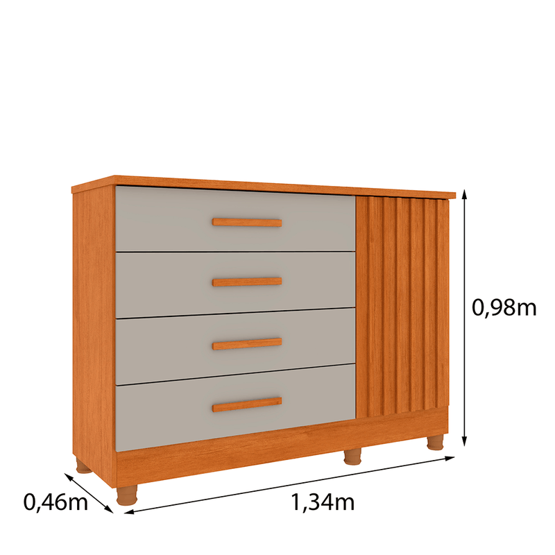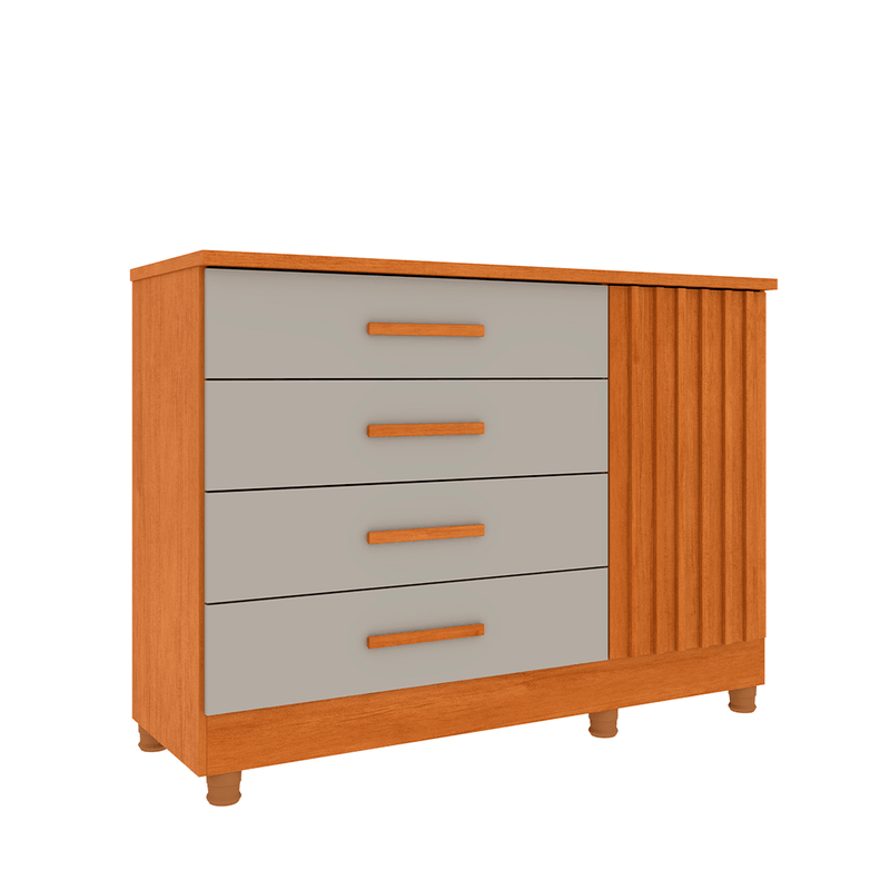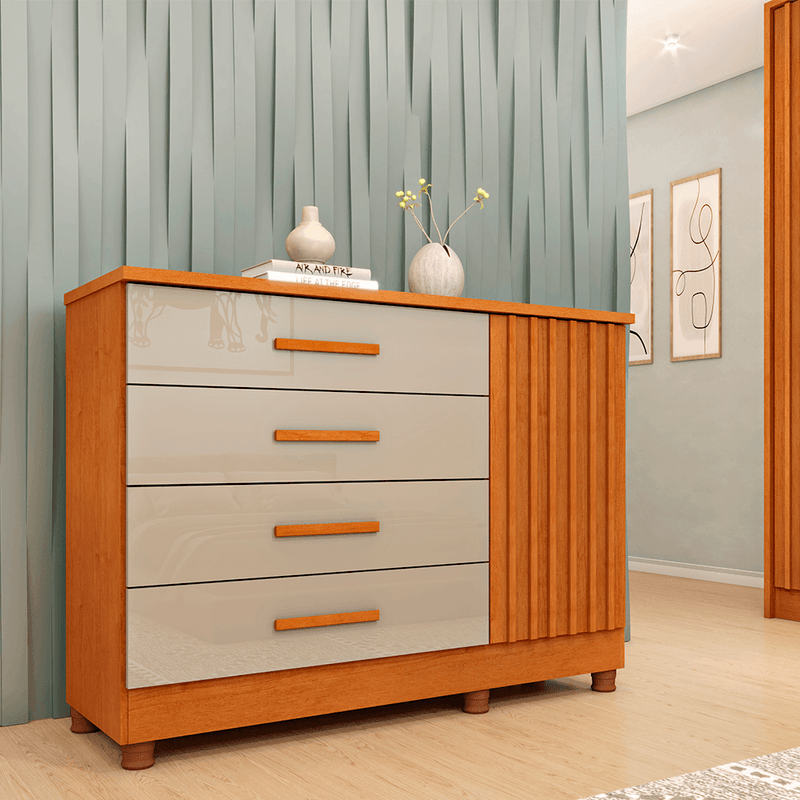 Com acabamento ripado na porta, que está em alta na decoração, ela combina a tonalidade Cinamomo com o Off White, criando um visual elegante, sofisticado e fácil de harmonizar com diferentes estilos. Possui 4 gavetas espaçosas, ideais para organizar roupas, acessórios e objetos pessoais, além de 1 porta com amplo espaço interno, oferecendo ainda mais praticidade no dia a dia.