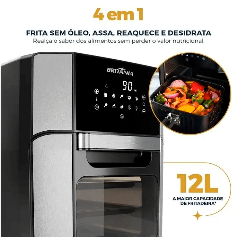 Receitas salgadas ou doces. O peixinho, a carne, a coxinha, a batatinha... Esses todo mundo já sabe que ficam uma delícia, Mas com a Air Fryer Oven da Britânia, você também pode preparar diversas receitas doces. Cookies, donuts, tortinhas, bolos e até pudim. Porta com Visor e Iluminação Interna. Acompanhe o preparo de suas receitas sem precisar abrir a porta e saiba o momento exato em que sua comida está pronta para saboreá-la.
