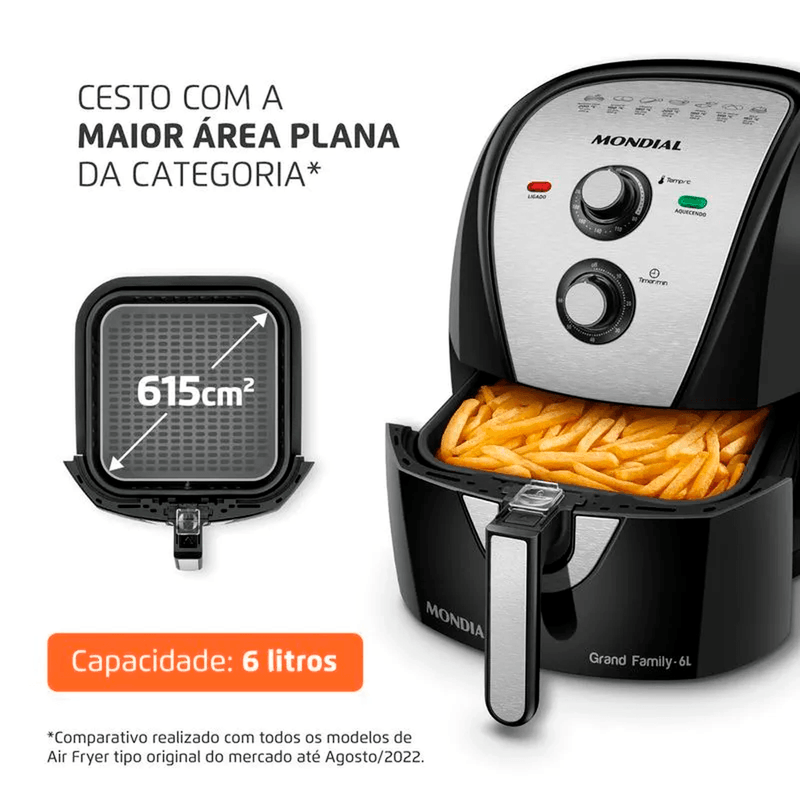 CAPACIDADE DE 6 LITROS + CESTO QUADRADOConsiderado o cesto com a maior área plana da categoria*, ele acomoda melhor os alimentos, permitindo assar e fritar por igual.