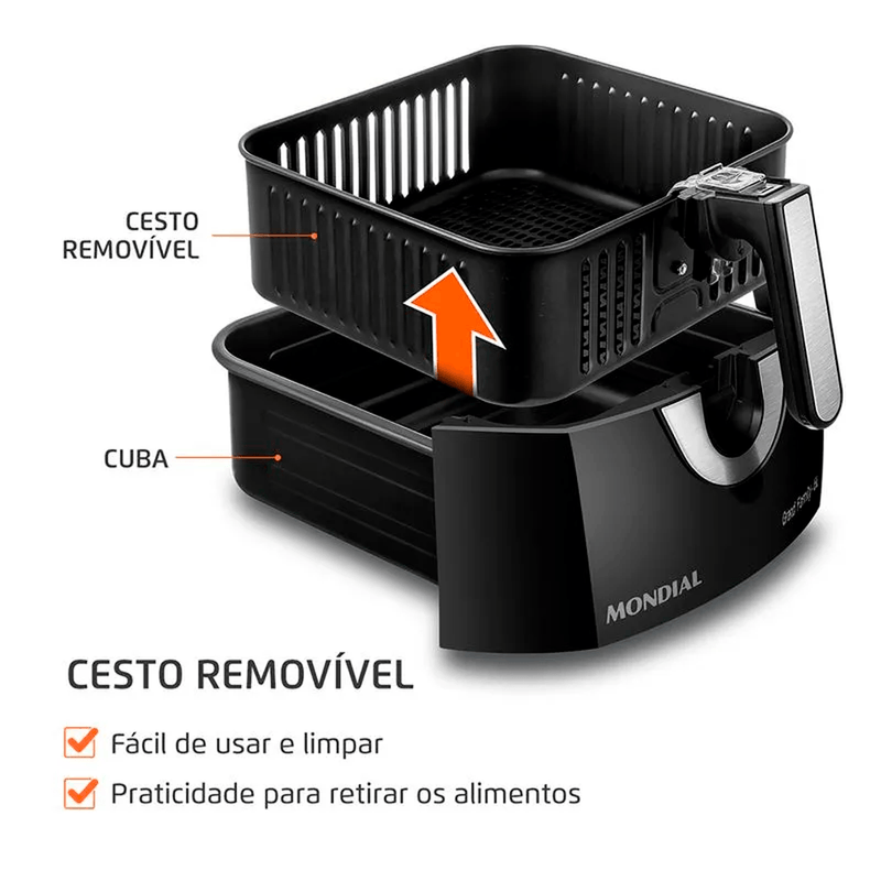 FÁCIL DE LIMPARA limpeza da parte interna é fácil, pois a cuba e o cesto são removíveis e antiaderentes.