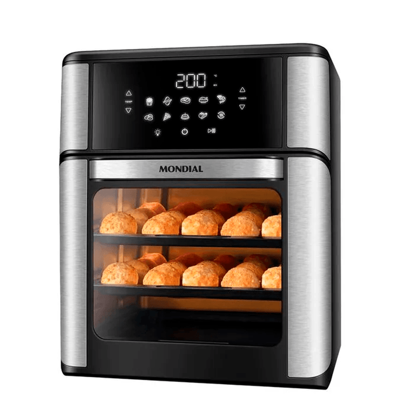 2 EM 1: AIR FRYER + FORNOA família de Air Fryers Mondial continua crescendo! O modelo OVEN alia as vantagens da tecnologia da Air Fryer ao espaço e versatilidade do forno. Você pode assar, cozinhar e fritar sem óleo e com perfeição.