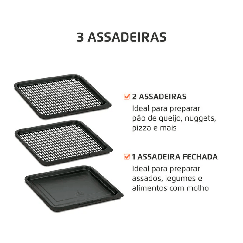 CESTO DE 5 LITROS + 3 EXCLUSIVAS ASSADEIRASVocê tem a opção de usar as exclusivas assadeiras com antiaderente, que são resistentes e fáceis de usar e limpar. As assadeiras são ideias para pão de queijo, nuggets, pizza, entre outros. Já o cesto, com capacidade de 5 litros, é indicado para preparar assados, batata frita, bolo e muito mais!