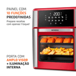 A Air Fryer Forno Mondial AFON-12L-RI une a praticidade da fritadeira a ar com a versatilidade de um forno. Perfeita para preparar refeições saudáveis e saborosas, ela assa, cozinha e frita sem necessidade de óleo.Com capacidade total de 12 litros, o modelo inclui um cesto de 5 litros e três assadeiras antiaderentes, ideais para preparar até três pratos ao mesmo tempo. O controle de temperatura e o timer de 60 minutos ajustáveis permitem elaborar receitas com mais precisão.O design funcional da fritadeira OVEN inclui ainda um painel digital com 10 funções predefinidas e visor amplo com iluminação interna, facilitando o monitoramento dos pratos. Sua alta potência e a tecnologia de circulação de ar quente proporcionam rapidez e eficiência. E o termostato inteligente reduz o consumo de energia.A Air Fryer Forno Mondial vem com luva de silicone para manusear com segurança as assadeiras quentes. Descubra como a AFON-12L-RI transforma a rotina na cozinha com praticidade e versatilidade em um único produto.2 em 1A linha de Air Fryer Mondial continua crescendo! E o modelo OVEN combina a eficiência da tecnologia da fritadeira a ar com o espaço e a funcionalidade de um forno.