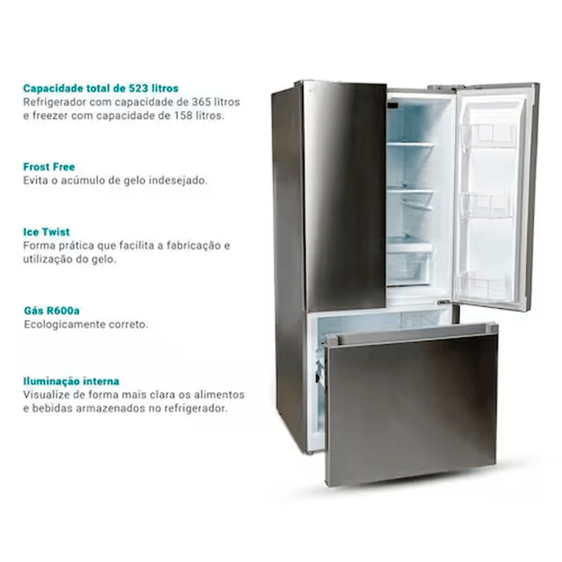 Design French DoorElegância e funcionalidade com duas portas superiores para o refrigerador e uma gaveta inferior espaçosa para o freezer.