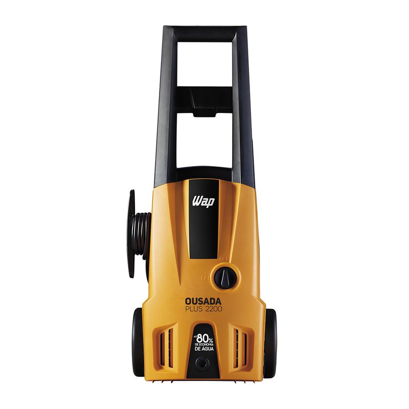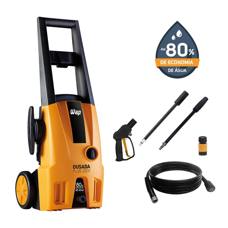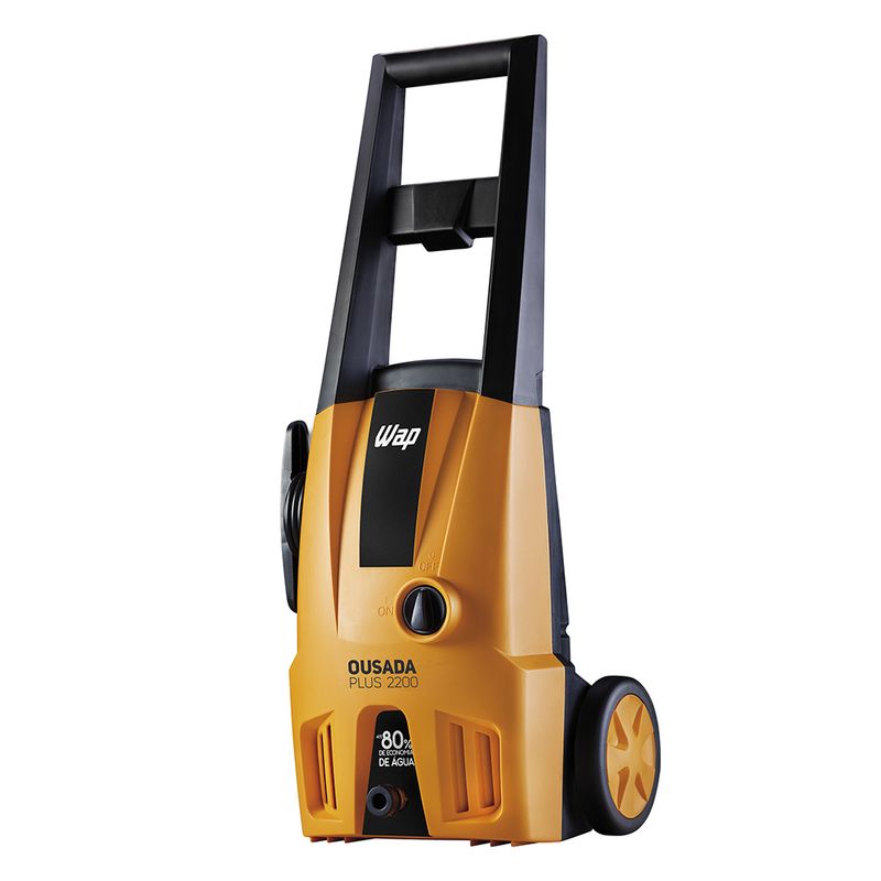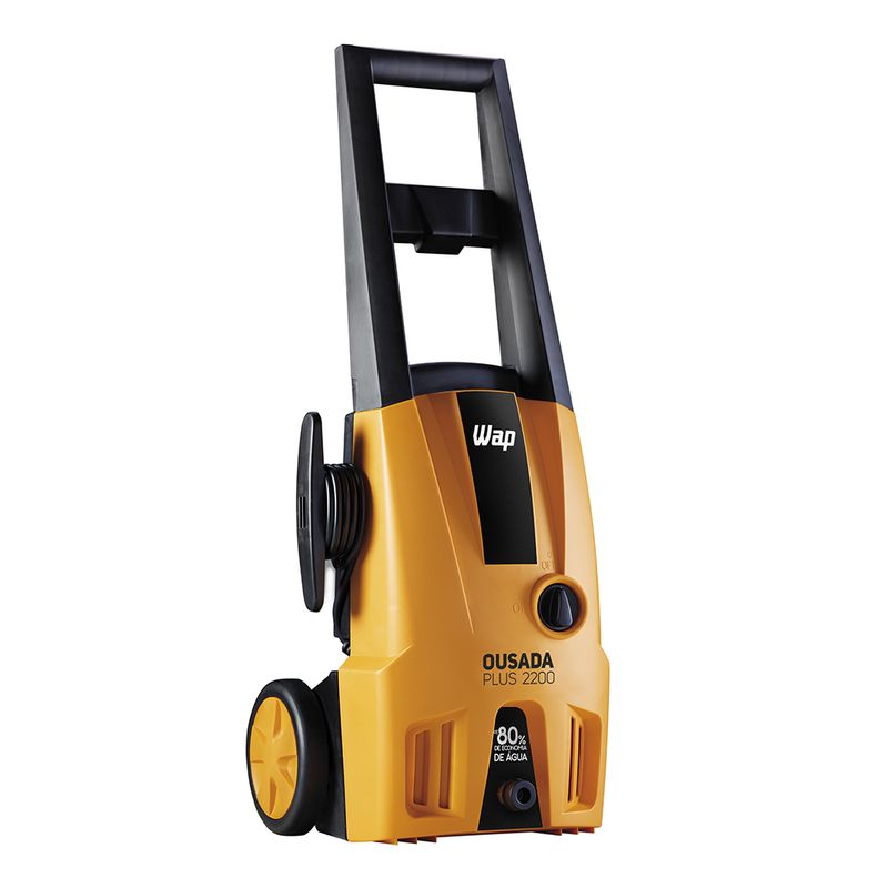 A Lavadora Ousada Plus tem potência 1500w, pressão máxima 1750psi, vazão máxima 342 L/h, alça ergonômica e rodas para transporte, fácil de usar.