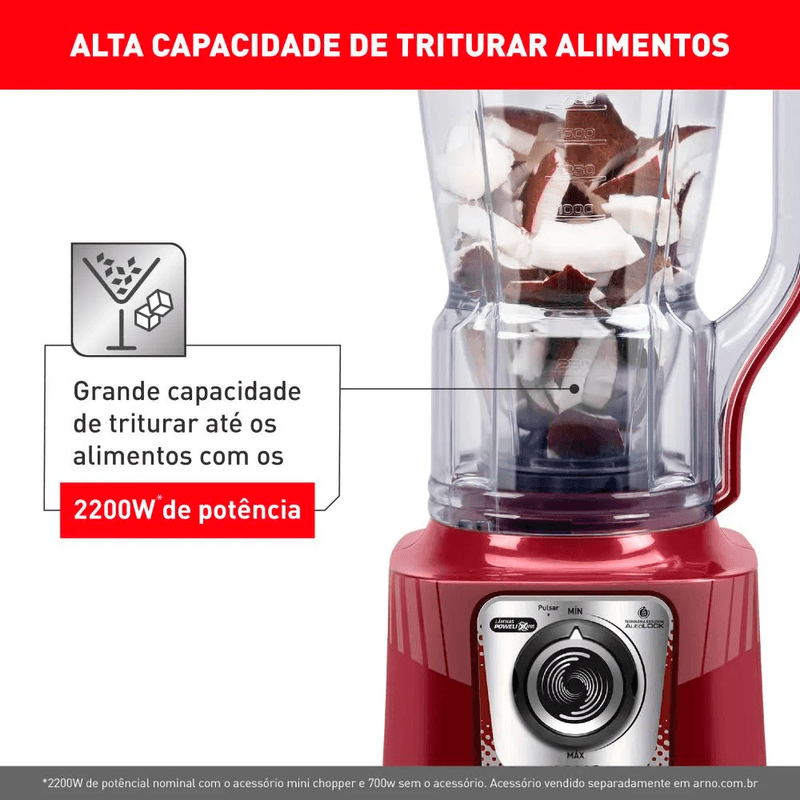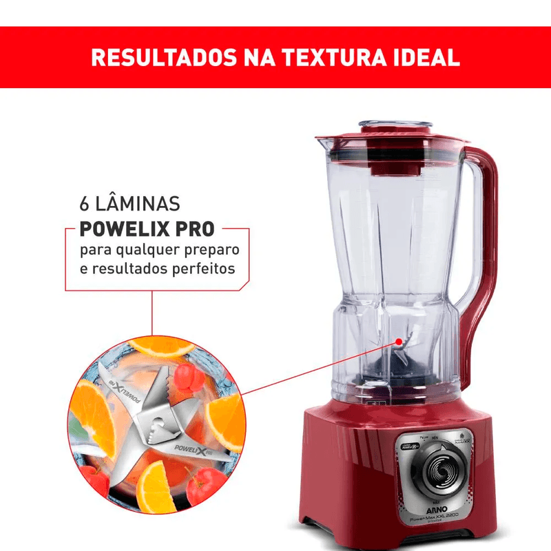 Arno Power Max 2200W XXL com a maior capacidade útil do mercado (2.25L). Tem 2200W de potência, combinados com as 6 lâminas Powelix Pro, com tecnologia autolock anti vazamento e Comfort Control, além da praticidade na limpeza com a tecnologia limpa fácil.