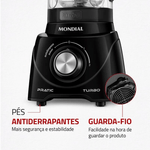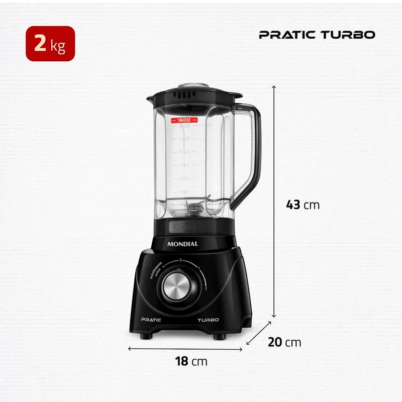 O Liquidificador Mondial Pratic Turbo L-98-B vai facilitar seu dia a dia na cozinha! Possui copo de 2,2 litros de capacidade total e 2 velocidades + pulsar. A potência de 550W é ideal para preparar sucos, vitaminas, sopas, mousses e muito mais. Conta com lâminas em aço inox que trituram e misturam os ingredientes com mais precisão e rapidez. Saiba mais sobre o L-98-B Mondial:CAPACIDADE TOTAL DE 2,2 LITROS*Que tal preparar sucos, vitaminas, molhos e outras receitas para toda a família? Você produz grandes porções de uma vez só e economiza seu tempo.
