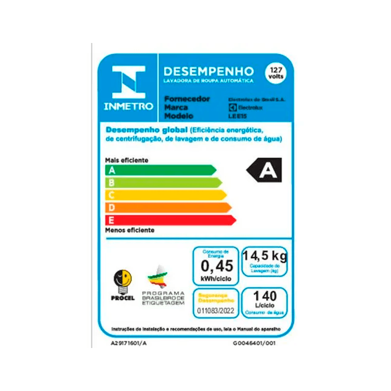 Consumo de energia: 0.45 (Kw/ciclo)