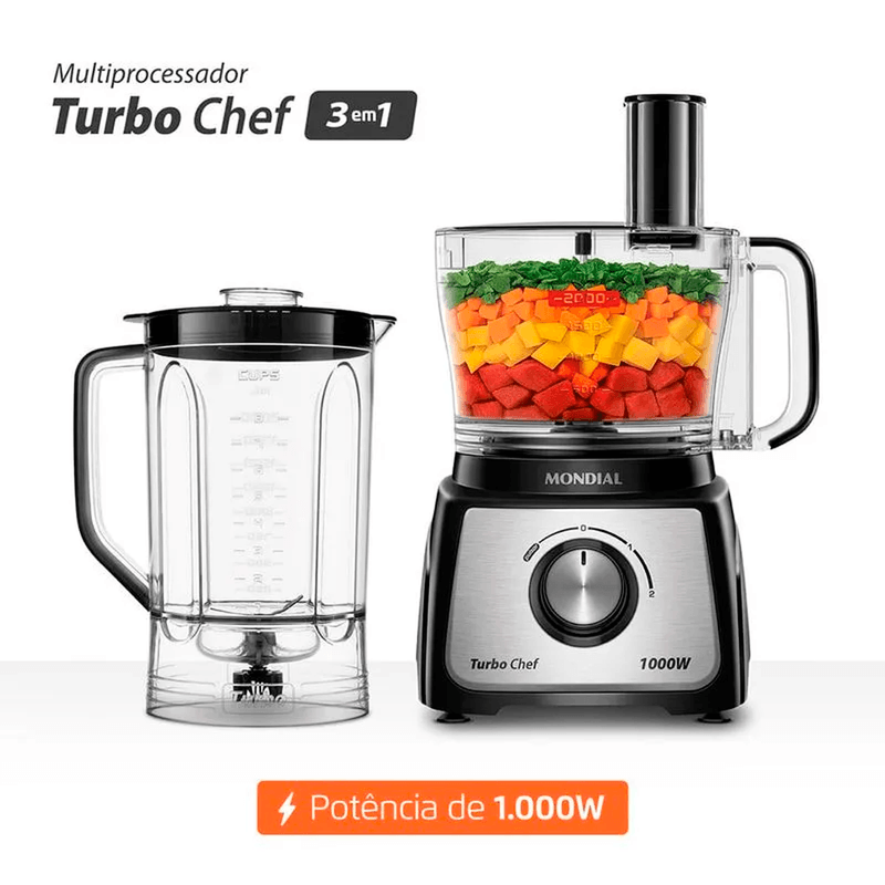 Com o Multiprocessador Mondial Turbo Chef 3 em 1 você conta com potência de 1.000W para triturar, processar e liquidificar com rapidez e eficiência. Ideal para facilitar o preparo dos alimentos no dia a dia e ganhar mais tempo na cozinha. O processador é perfeito para carnes, queijos, vegetais e temperos, enquanto o liquidificador prepara sucos, vitaminas, molhos e massas com facilidade.Conta com 2 velocidades e função turbo para ajustar a intensidade conforme a necessidade, além de bocal alimentador que permite adicionar ingredientes durante o preparo. Além disso, a trava de segurança mantém tudo bem encaixado antes de começar. Com peças removíveis para uma limpeza rápida, armazenamento compacto e pés antiderrapantes, você terá praticidade e liberdade para criar pratos incríveis. Saiba mais sobre o MPN-02-BE Mondial:Potência de 1.000WÓtimo desempenho e mais agilidade no dia a dia. Surpreenda-se com os resultados no preparo das suas receitas.