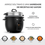 Com capacidade de até 1 litro, o preparo dura apenas 20 minutos, sendo ideal para refeições rápidas e saudáveis. O suporte para cozimento no vapor permite o preparo de vegetais ou peixes ao mesmo tempo, sem perder espaço no recipiente principal.