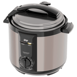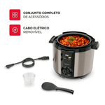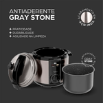 A capacidade interna de 5 litros da Panela de Pressão Elétrica é perfeita para preparar porções para a família toda. Seu recipiente interno removível é revestido com dupla camada antiaderente Gray Stone, o que evita que o alimento grude no fundo da panela, facilitando a limpeza.