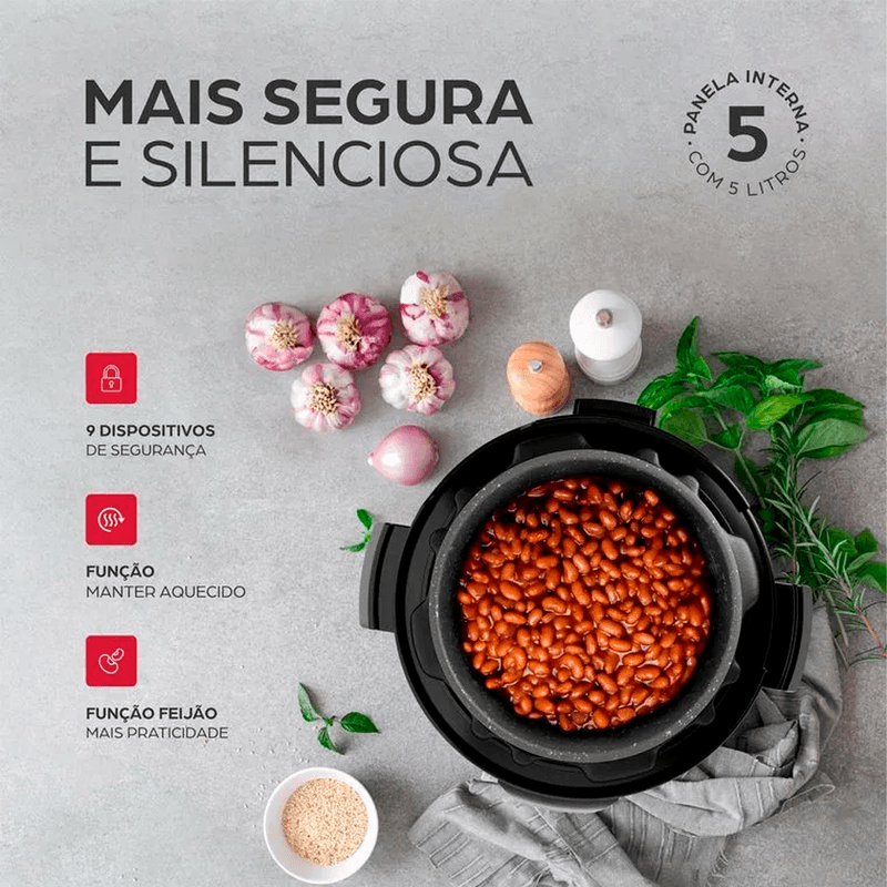 Ao selecionar a “Função Feijão”, a cocção dos grãos é feita em menos tempo do que os métodos tradicionais, sem nunca perder o sabor. E, ao final do preparo, o desligamento automático ativa a "Função Manter Aquecido". Ela garante que os pratos permaneçam na temperatura ideal até a hora de servir.