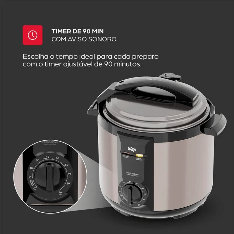 Imagine saborear vegetais, sopas, refogar temperos e alimentos rapidamente, tudo no ponto ideal. Com o timer de 90 minutos e aviso sonoro isso é possível! A panela de pressão elétrica 5L WAP permite criar uma variedade de pratos, ajustando o tempo de preparo de forma precisa para cada receita.