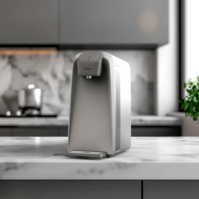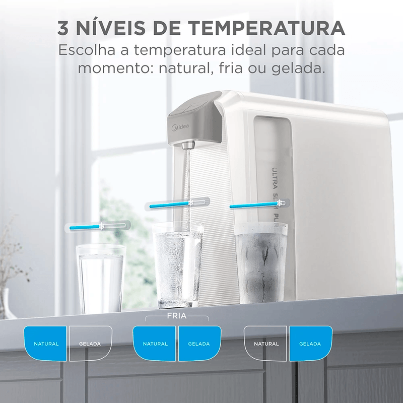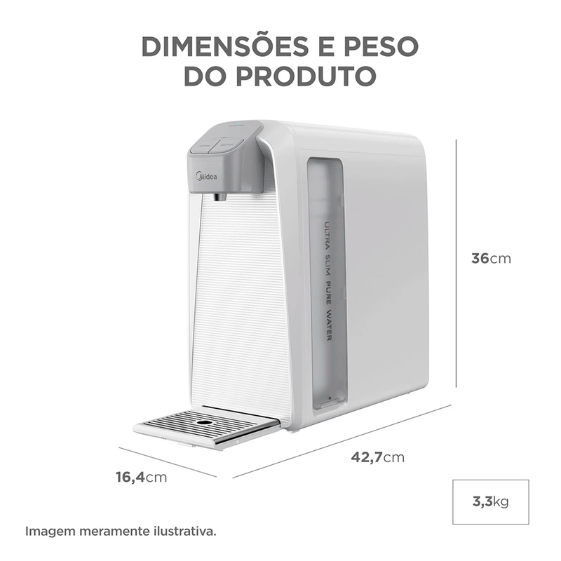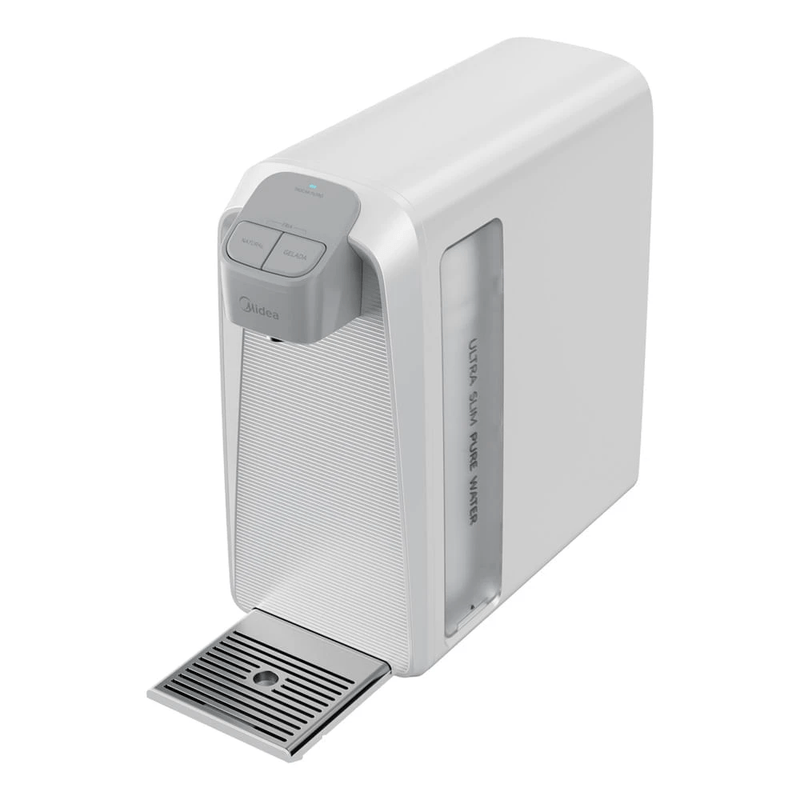 Purificador de Água SlimPure Bivolt Midea Com uma combinação perfeita entre design compacto e alta eficiência de filtragem, o novo Purificador SlimPure Midea oferece água pura e saudável. Seu design ultra slim otimiza o espaço e proporciona flexibilidade, permitindo a instalação na bancada ou na parede.