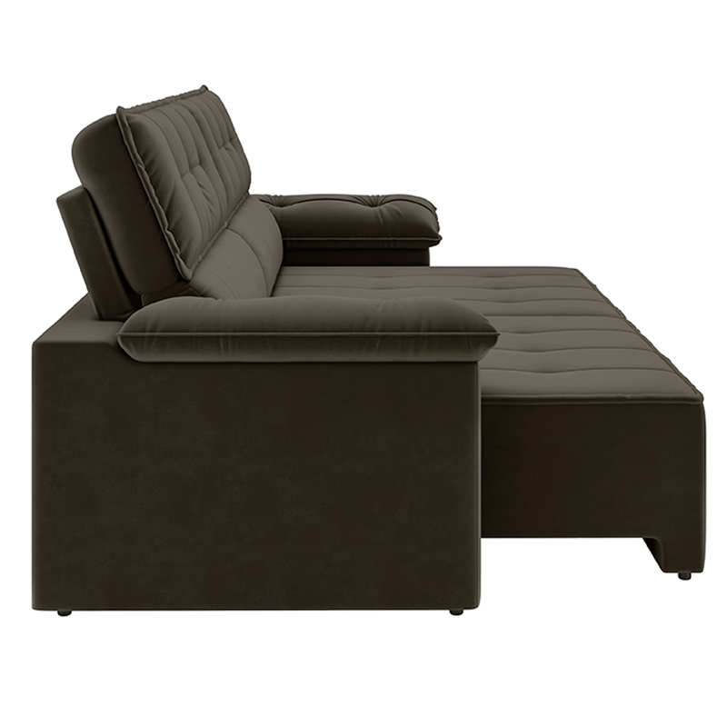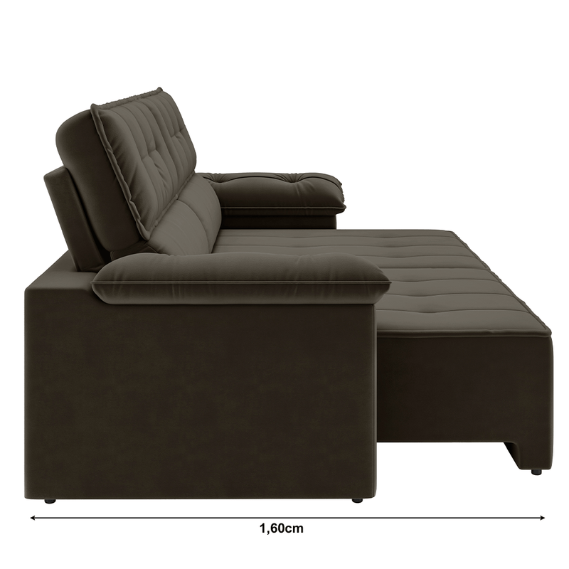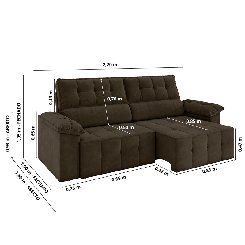 Medindo 2,20 m de largura, 1,05 m de altura e até 1,60 m de profundidade quando aberto, o sofá conta com pés em PVC de 10 cm e rodízios para fácil movimentação. Ideal para salas modernas que valorizam o design funcional e o bem estar.