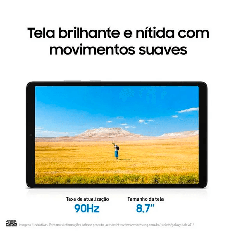 Tela brilhante e nítida com movimentos suavesAproveite a tela brilhante e nítida do Galaxy Tab A11, otimizada para o entretenimento. A taxa de atualização de 90Hz garante movimentos mais naturais e fluidos para assistir a vídeos, jogar ou rolar o feed das redes sociais. Mesmo sob luz direta do sol, a tela continua nítida e brilhante, oferecendo ótima visibilidade a qualquer hora e em qualquer lugar.