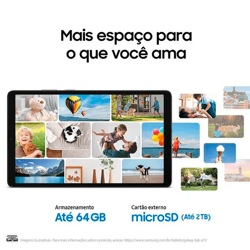Mais espaço para o que você amaO Galaxy Tab A11 possui memória e armazenamento amplos. Com até 4 GB de memória, você aproveita um tablet multitarefa rápido e fluido, enquanto o armazenamento de 64 GB garante espaço para arquivos grandes. E, se precisar, ainda é possível expandir até 2 TB com um cartão microSD.
